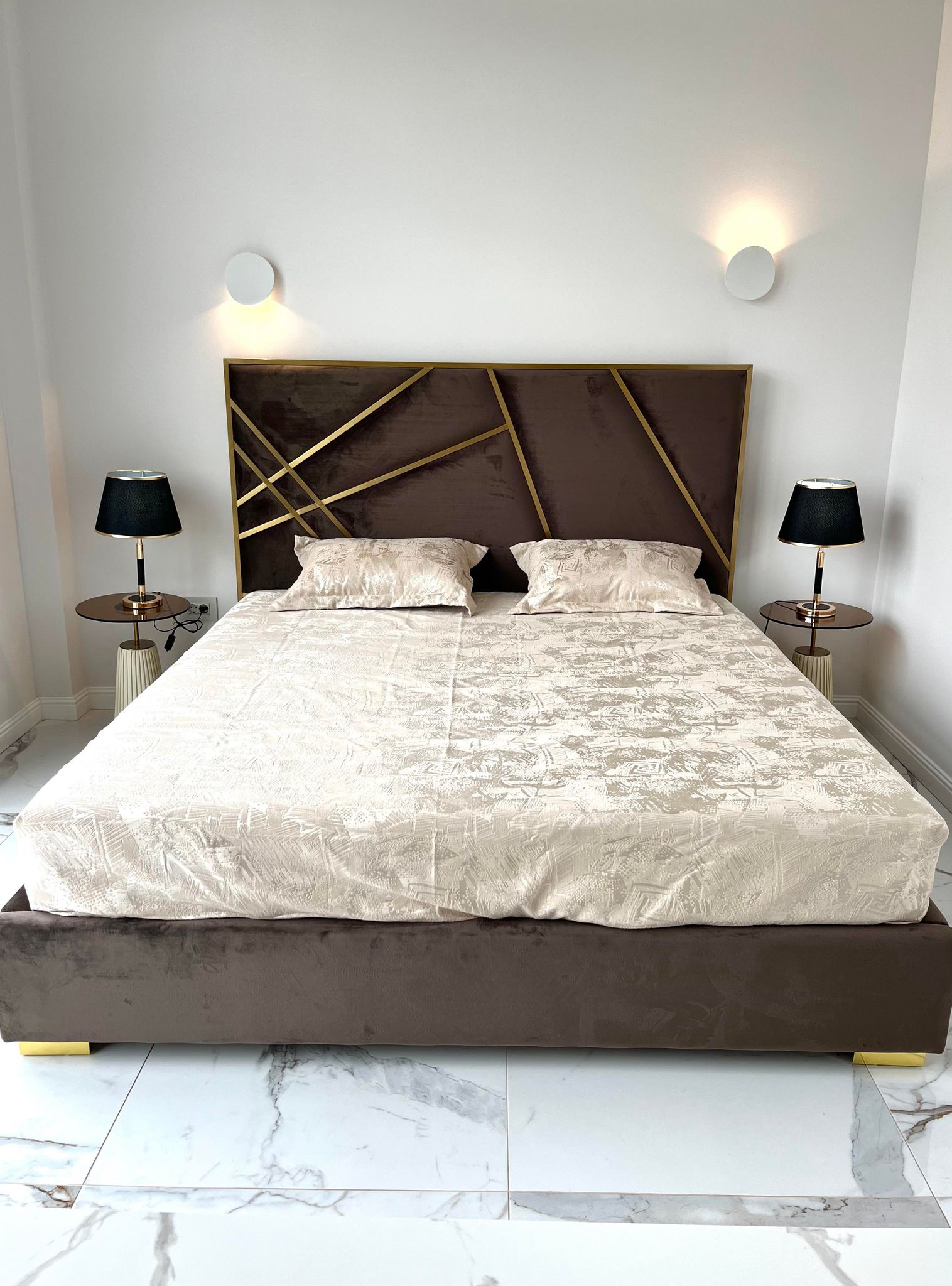 Tăblia tapițată, dreapta a patului Brown corespunde celor mai recente tendințe în materie de amenajări interioare. Aspectul sofisticat este întregit de suprafața generoasă de odihnă, care asigură un somn liniștit. Accentele metalice din cupru integral dau un aspect modern și sofisticat care se potrivi deopotrivă într-un decor modern, industrial sau chiar minimalist.