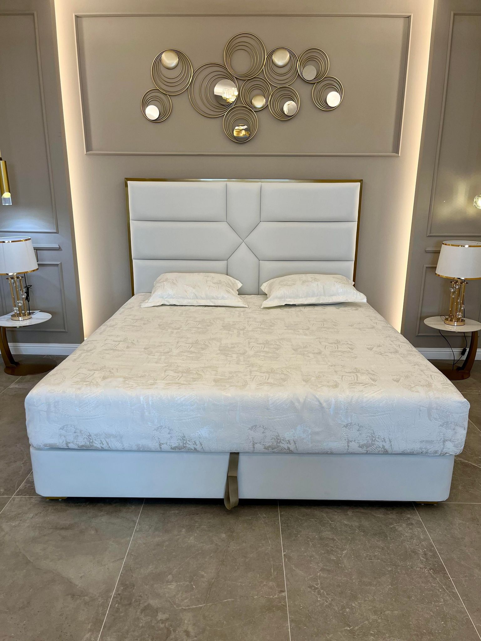 Patul Extravagancia cu somieră pneumatică inclusă are o tăblie opulentă, din piele ecologică, care se remarcă prin decorul impresionant. Confortul este sporit de cadrul de pat.