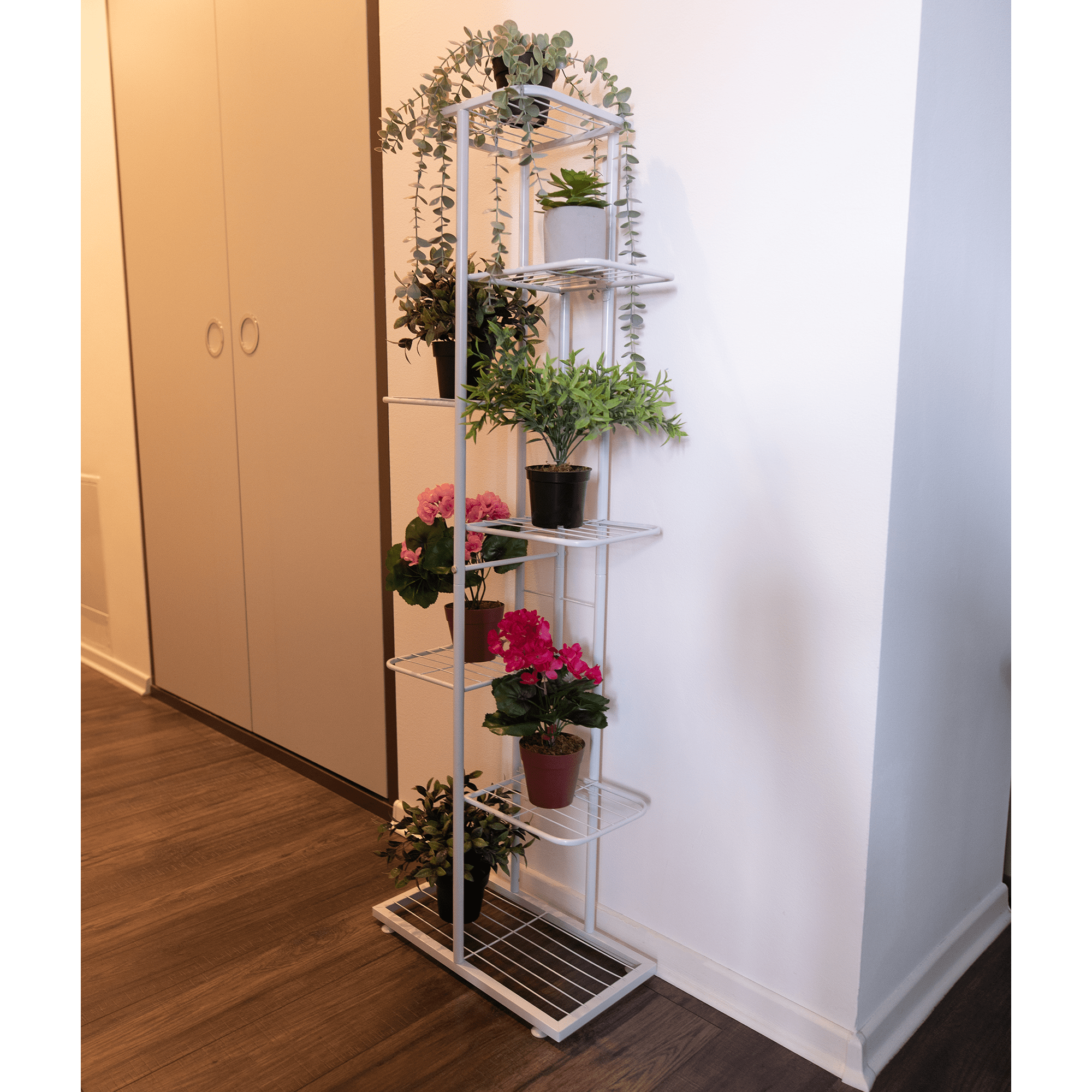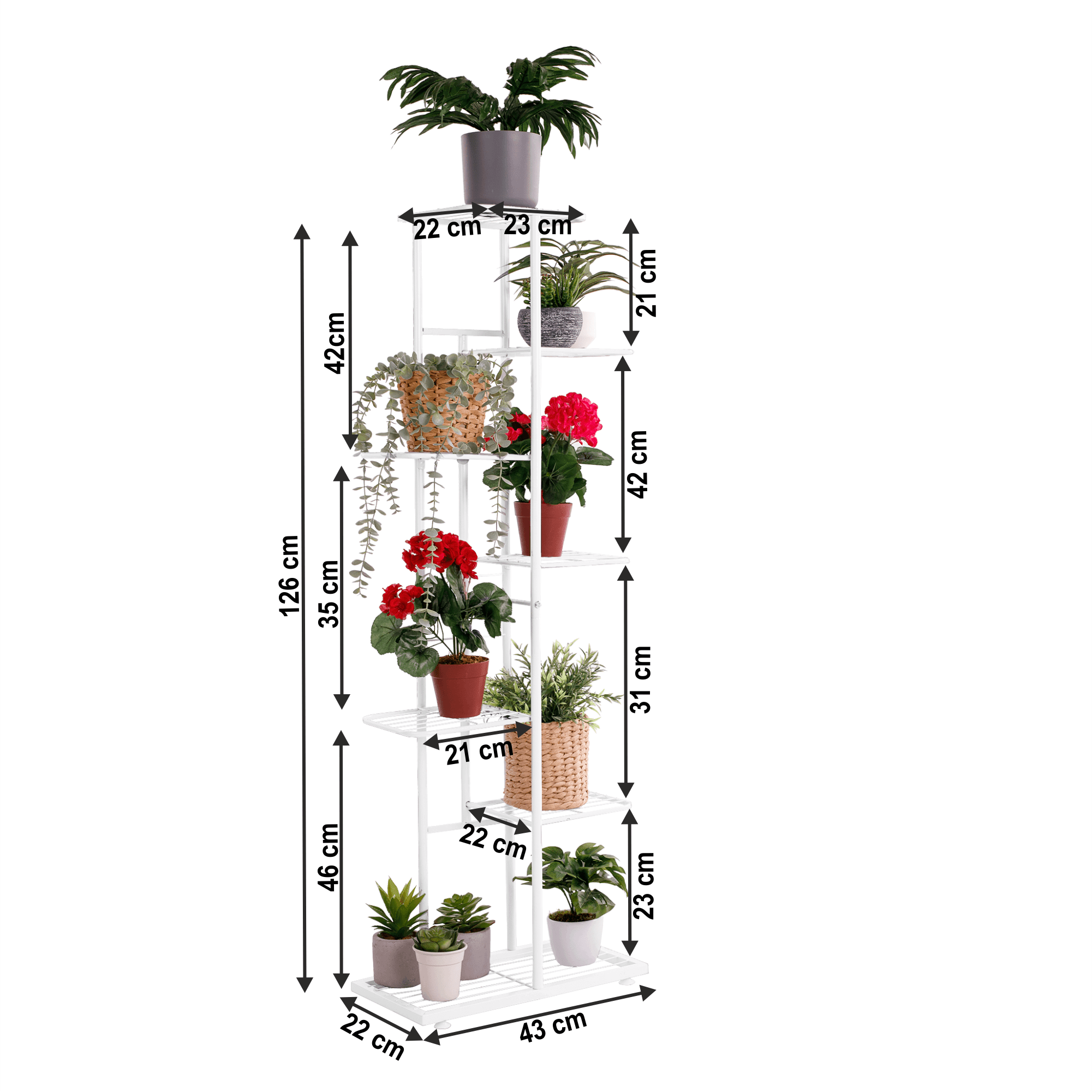 Material: metal Culoare: alb Dimensiuni (LxIxH): 43x22x126 cm Capacitate de încărcare pe raft: 2 kg Grosime bare: 1,6 cm Dimensiuni raft (Lxl): 21x22 cm Înălţimea raftului inferior: 23 cm Înălţimea celui de-al doilea raft: 31 cm Înălţimea celui de-al treilea raft: 42 cm Înălţimea raftului superior: 21 cm Construcţie metalică 7 rafturi Stil modern Ca suport pentru plante în ghivece Picioare finisate, flexibile pentru a compensa denivelările de suprafaţă Furnizat nemontat