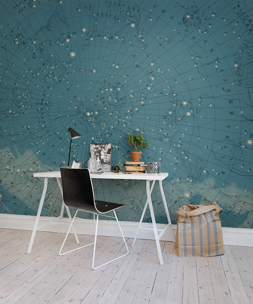 Un fototapet pentru tavan. Aceasta este o ilustratie fantastica a hartii constelatiei a emisferei de nord din anul 1869. Constelatii ilustrate pe un fundal albastru. Ai indrazni?