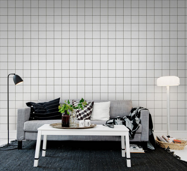 Placile albe si imbinarile inchise la culoare creeaza un grilaj grafic. Pentru peretele din bucatarie sau chiar in orice camera, grilajul este un mod de a ilumina totul - tablouri, oglinzi, postere. Un fototapet cu structura.